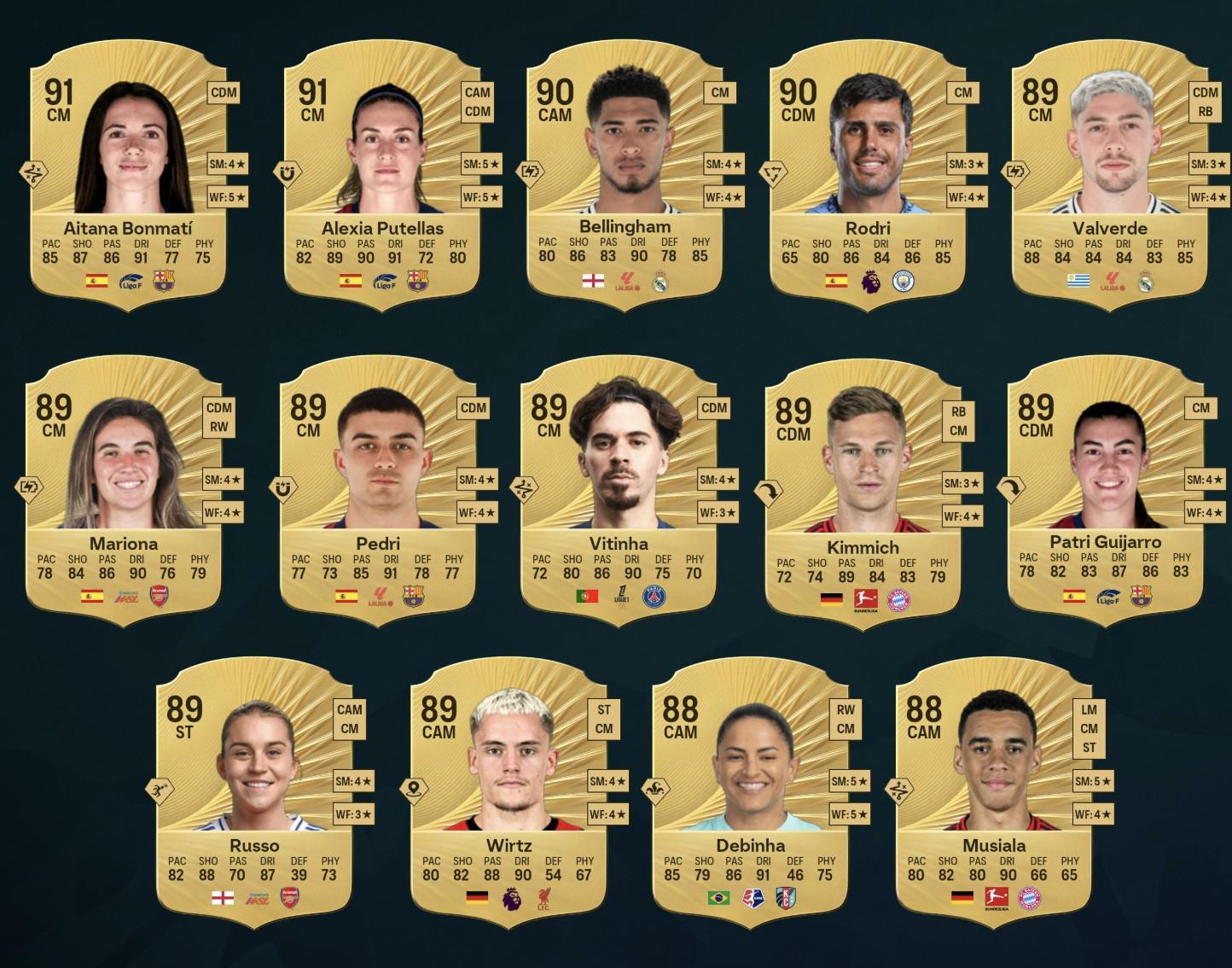 《FC26》中的中场球员前14已经遭到曝光,其中,贝林厄姆和罗德里并列男足第一,维尔茨、巴尔韦德在列。1-14:艾塔纳-邦马蒂 - 91普特利亚斯 - 91贝林厄姆 - 90罗德里 - 90巴尔韦德 - 89马里奥娜-卡尔登泰 - 89佩德里 - 89维蒂尼亚 - 89基米希 - 89吉哈罗 - 89阿莱西亚-鲁索 - 89维尔茨 - 89德比尼亚 - 88...